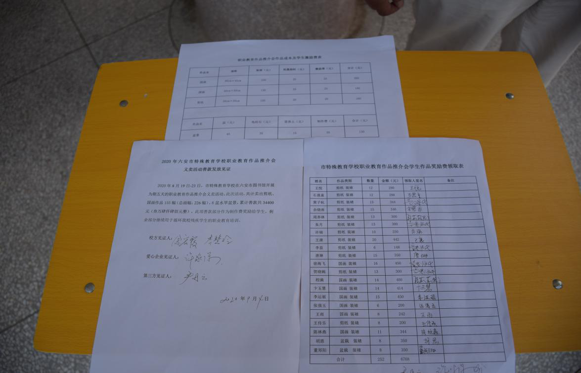 发放仪式现场,所有善款在全体师生及学生家长、爱心企业(六安市特教励志技能推广中心)、第三方见证人(六安市图书馆人员)的共同见证下,部分作为制作费奖励给了参与创作义卖作品的学生,剩余部分将继续用于六安市励志特教技能推广中心循环残疾学生的职业教育培训。