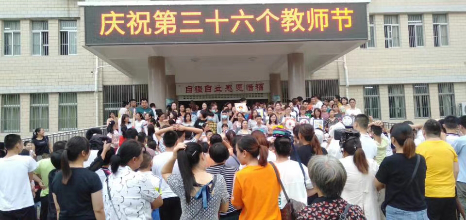 第一节课后,全体师生集中在教学楼前,学生们向每一位老师献上自己亲手制作的贺卡。