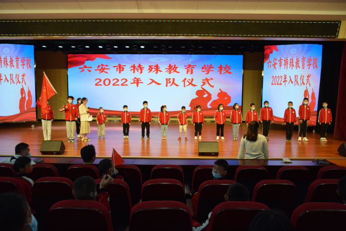5月24日下午,六安市特殊教育学校在校报告厅举行了庄严的新队员入队仪式。来自我校低年级各班共13名学生戴上了鲜艳的红领巾,孩子们庄严地举起右手,身着整齐干净的校服,站姿笔直,在队旗下光荣的宣誓,加入中国少年先锋队,成为了一名少先队员。