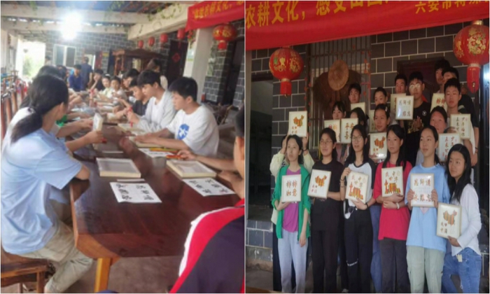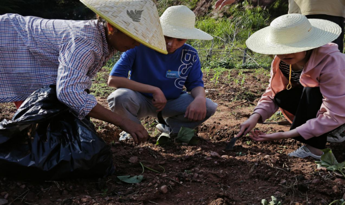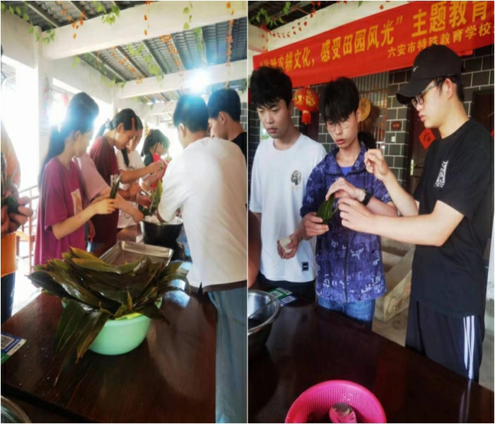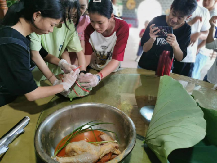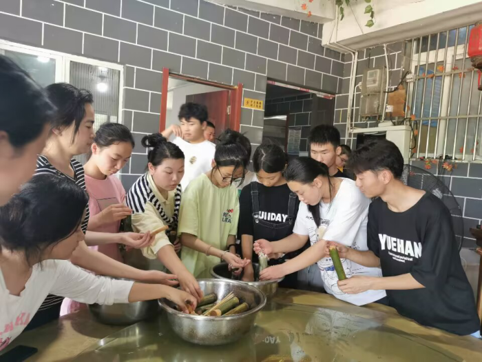 在如艳种养殖合作社实践基地,同学们积极性高涨,学习传统工艺竹编技艺、农耕技术和美食制作等。在竹编老师的指导下,手巧心细的同学们跃跃欲试,彩色的竹篾在同学们的手指间灵活的穿梭,一幅幅精美的作品逐渐被摆在了桌上。在制作美食糯米粽、竹筒粽和荷叶鸡过程中,一开始同学们总是捏不紧粽叶、漏米,手中的棉线也不听使唤,但经过反复练习,大家不仅能制作出外表美观的粽子,甚至还能一起比拼速度,现场学习氛围浓厚。