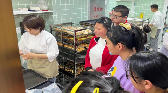 烘焙课上,专业老师向学生们介绍烘焙制作原料、操作要领,并演示制作流程——搅拌鸡蛋、打发面粉、添加配料、到最后的装饰,大家认真听讲,制作过程与老师积极互动,经过一个多小时的努力,一个个漂亮的成品出炉,大家品尝着自己劳动成果,喜悦之情溢于言表。