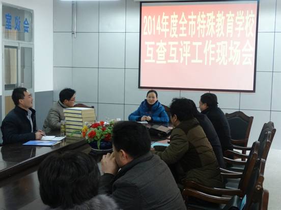 市教育局基教科胡晓林园长亲临特教中心互查互评现场并进行工作指导,对此次全市特殊教育学校“互查互评”成员进行慰问,并与各特教学校校长就2014年度有关工作总结和下一步学校工作打算进行了座谈。(文字:方放 图片:方放)