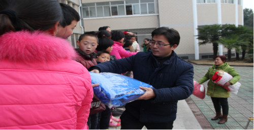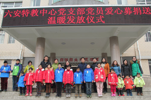 1月13日上午,中共六安特教中心党支部用党员捐赠的善款为20名贫困学生买来了棉衣和棉鞋,并在学校大门前广场举行了捐赠发放仪式。