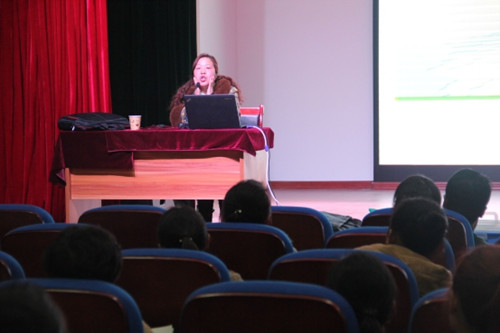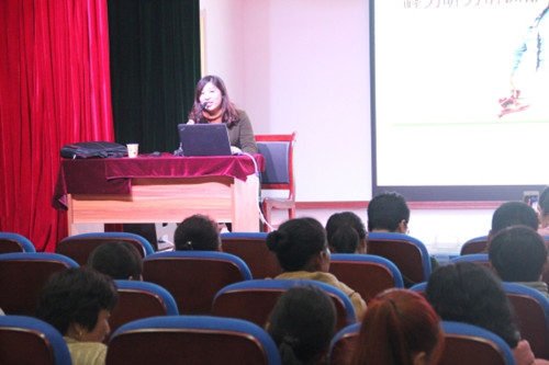 培训会第二项内容,是由康复部专业老师程秀桂做“教学中常规活动的一些训练内容与方法”的讲座,详细解说了常规活动的三个方面内容,包括舌操,辩听训练及发音训练。