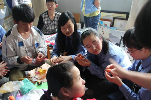 在美工室陪孩子们一起上美术课,跟孩子们学习制作手工品