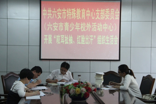 6月2日下午,中共六安市特殊教育中心党支部委员会(六安市青少年校外活动中心)就开展“咬耳扯袖、红脸出汗”工作专门召开组织生活会,会议传达了《中共六安市委办公室关于开展“咬耳扯袖、红脸出汗”工作实施意见(试行)的通知》、讨论并完善了六安市特殊教育中心贯彻“咬耳扯袖、红脸出汗”工作实施方案,学习了《中国共产党章程》、《中国共产党廉洁自律准则》、习近平总书记系列讲话的部分内容。支部成员对开展“咬耳扯袖、红脸出汗”工作提出了自己意见,并商讨了有效的整改措施。