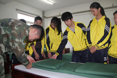 武警官兵们对这一群特殊的孩子们的到来,给予了热情的欢迎,和特别的关爱。官兵们先后带领师生参观了驾驶员培训训练场,详细地向孩子们介绍了各个训练场地的功能,让师生深入到汽车模拟驾驶室,让孩子们了解了简单的汽车内部结构和操作规范,尤其是师生走进官兵们的宿舍时,看到战士们的宿舍整齐划一,物品摆放有致,不由地惊叹起来,随后官兵们手把手教同学们学习叠被子等整理内务。