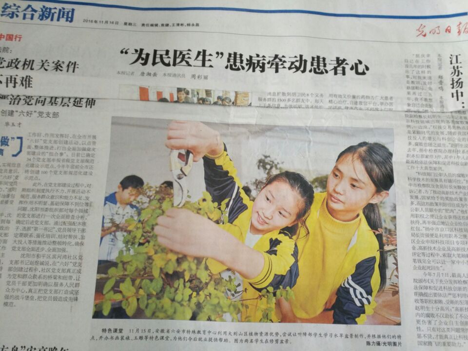 六安市特殊教育中心自2014年底,在学前康复、九年义务教育的基础上开始尝试对听障部学生开展水旱盆景制作培训,书画装裱、工艺品制作等特色课堂。学校从社会联系了各方面的专家、爱心人士作为老师,定期对学生进行培训。目前共有近20名听障学生完全掌握水旱盆景的制作流程,并能独立制作出的完整的水旱盆景作品。2016年11月16日人民日报、光明日报等众多报刊都刊登了我校学生制作盆景的场景,孩子们看到自己上报纸了也非常开心,都纷纷表示一定要学好这项技能,努力做一个残而不废的人。(图片、文字:何良燕)