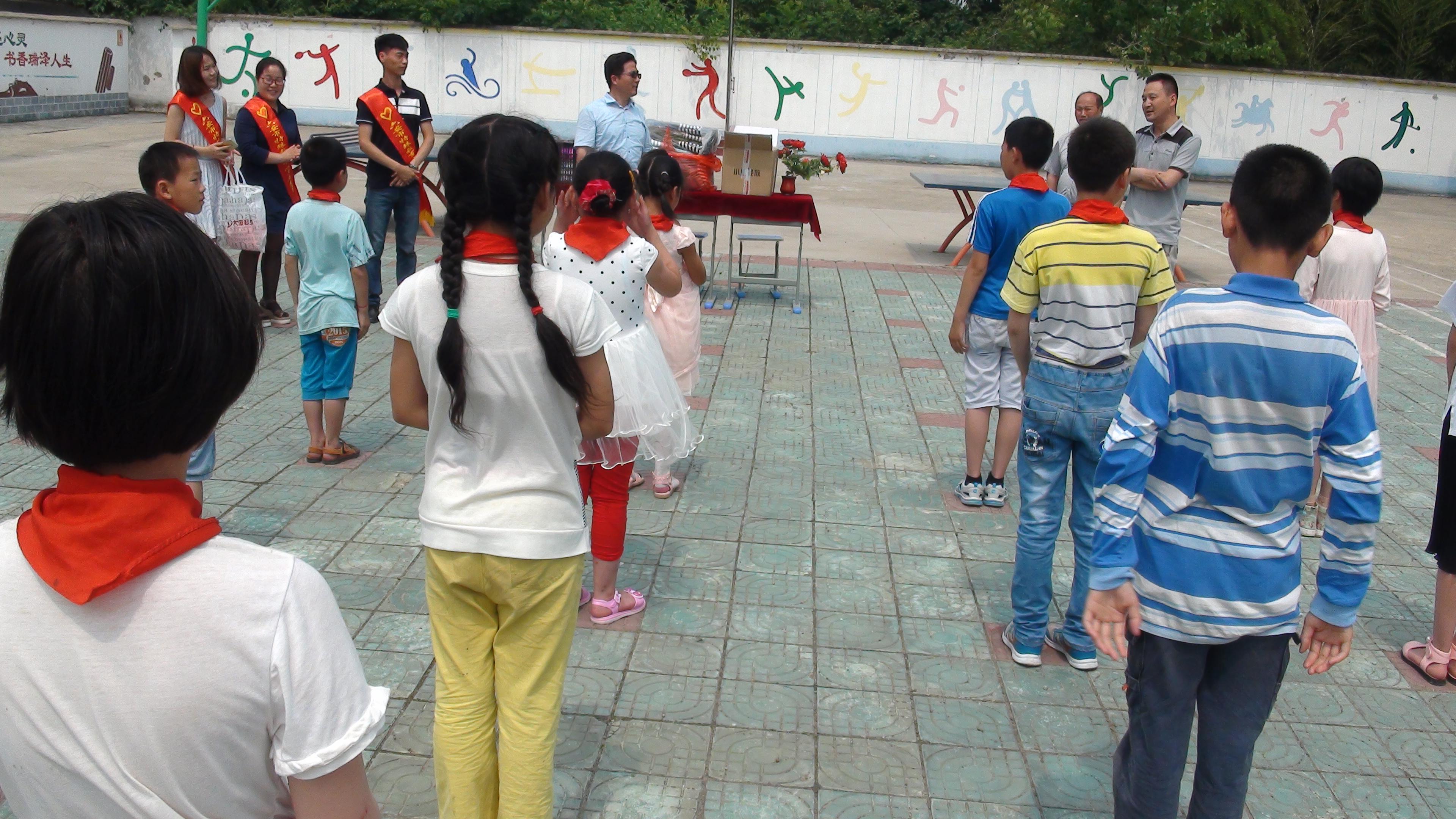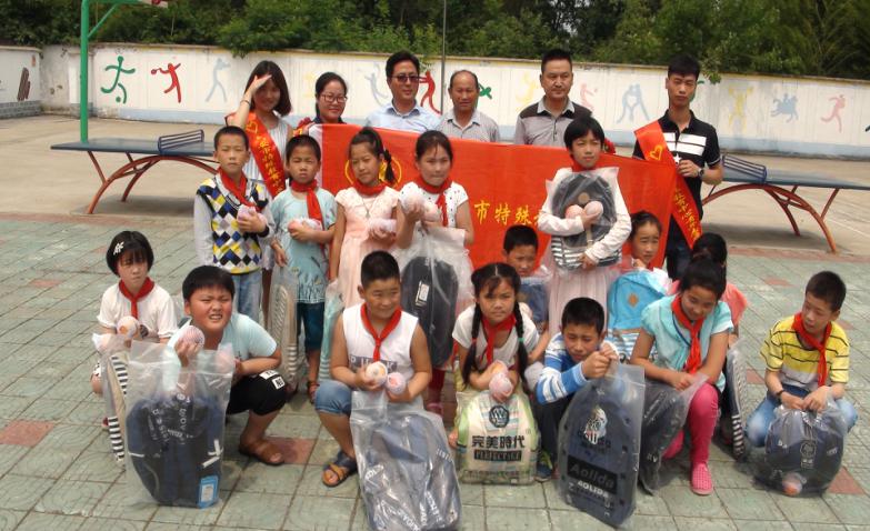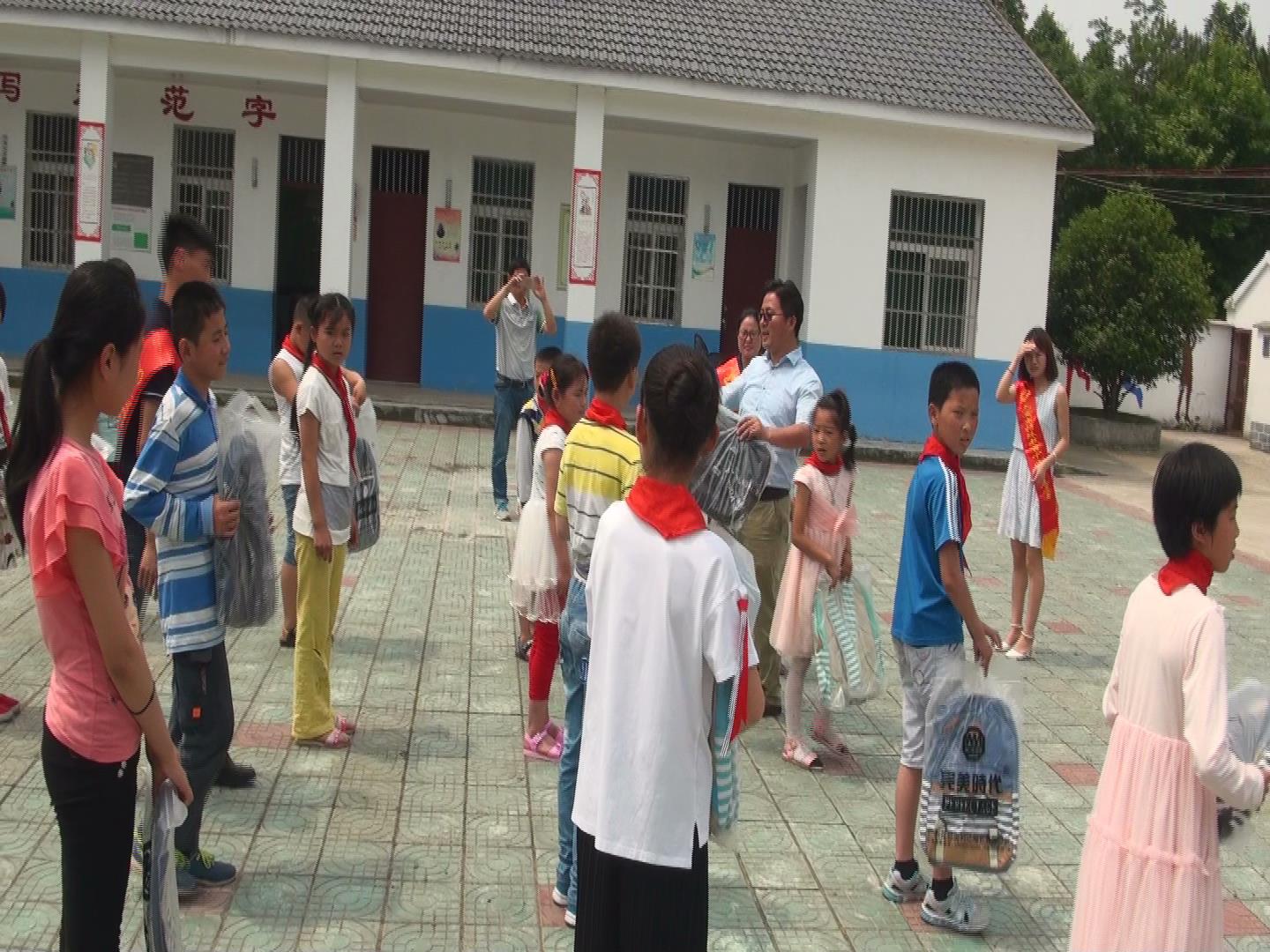 慰问小组给松林岗小学的学生们带来了漂亮的书包和新鲜的水果,也给辛勤劳作在松林岗村小学教学一线的老师们送上了精美的礼品。陈校长和青年志愿者教师将礼物送给孩子们,帮助该校留守儿童和孤儿度过一个愉快的儿童节。收到这份特别的儿童节礼物,松林岗小学的学生们童真的脸庞挂上开心的笑容。