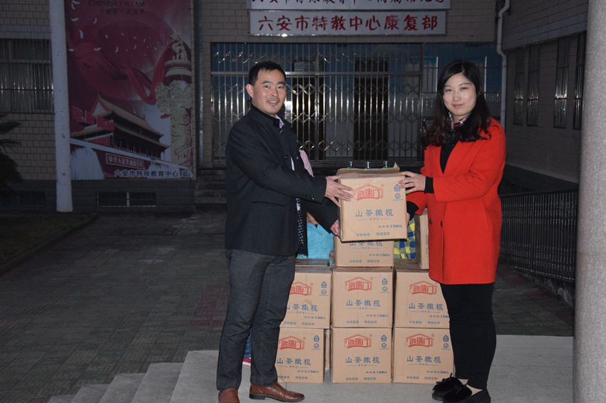 11月27日下午,市残联携手江西四海粮油有限公司,带着浓浓爱心,到六安市特殊教育中心开展爱心捐赠公益活动,现场将14箱多“爱心茶油”送到学校康复部老师的手中,并将市残联领导的期望和爱心的心愿带给在场的老师和学生家长。