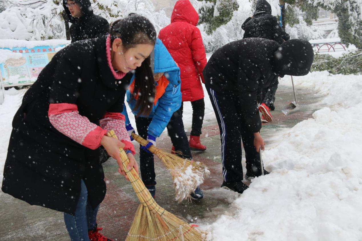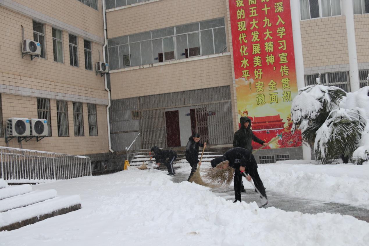 1月4日下午,在陈中芳校长带领下,师生铲除校园主干道、楼梯口等积雪,收捡大雪压断的枯枝,用竹竿拨打香樟、雪松、桂花树、竹林等绿化苗木上的积雪,把绿化苗木因积雪损毁的程度降到最低;在生活楼、教学楼出口处铺设地毯,方便师生安全行走;对学校车棚,走道、学生宿舍等钢结构的地方进行巡查,放置提示牌,消除安全隐患。