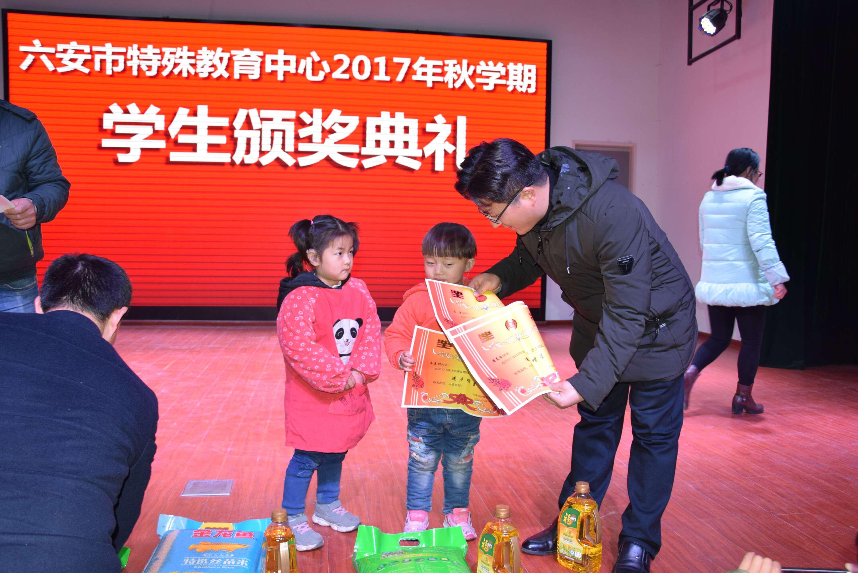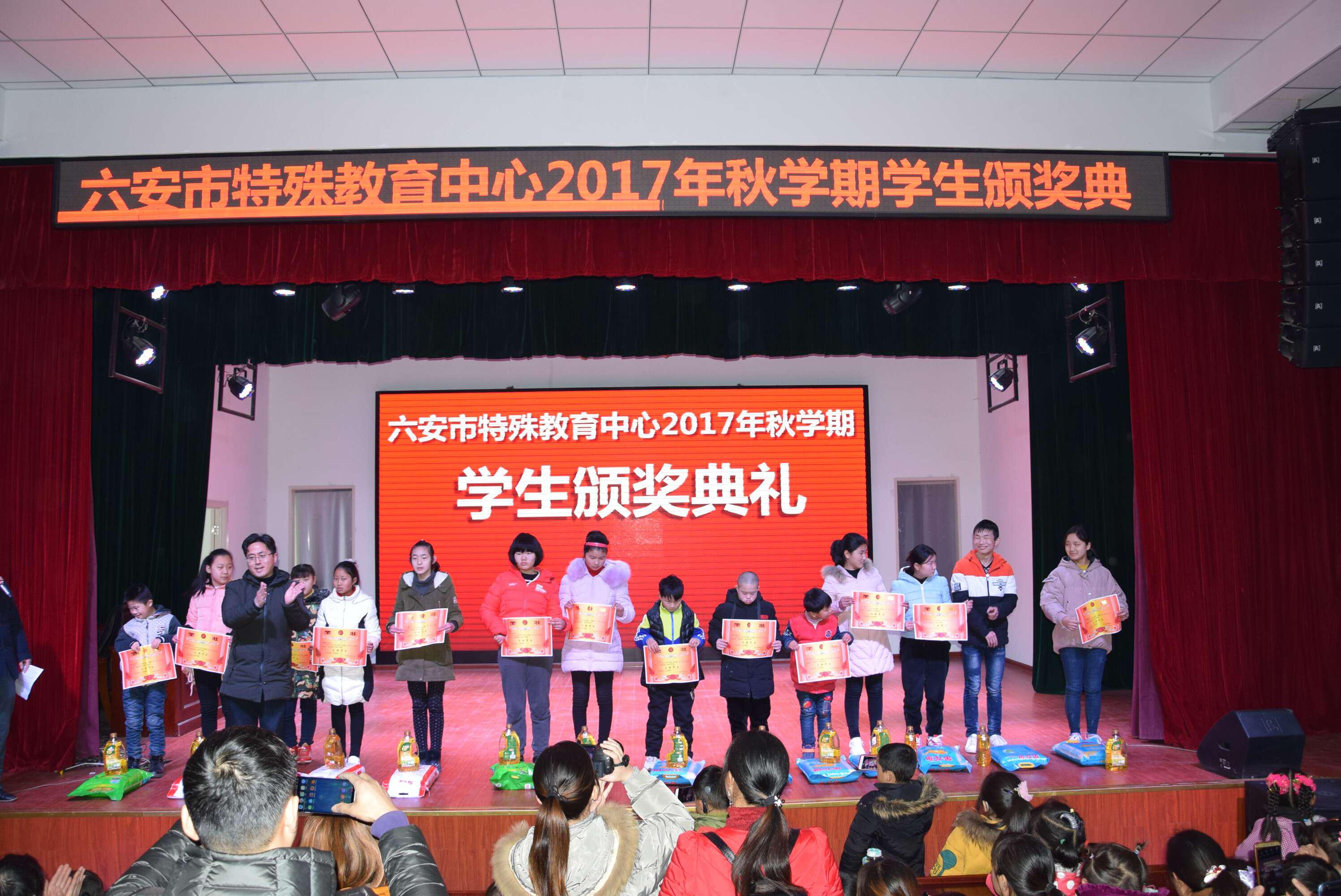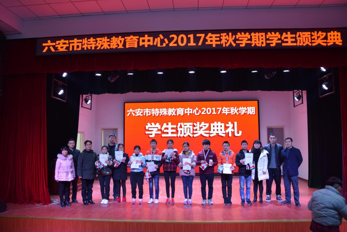 新学期开学的第一天,六安市特殊教育中心在学校礼堂举行了2017年秋学期学生颁奖典礼活动,此项活动因2017年秋学期末的一场突如其来的大雪被推迟了,但这丝毫没有影响典礼的热烈气氛。