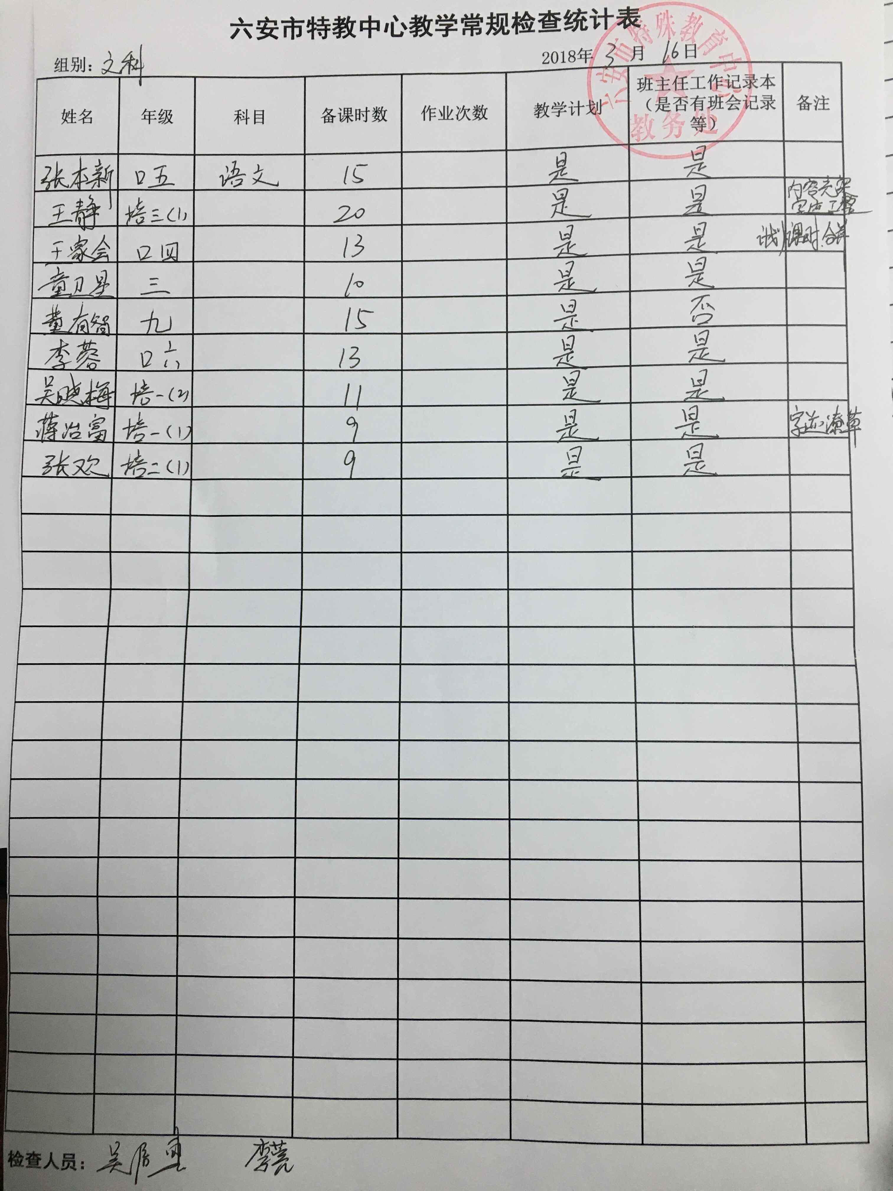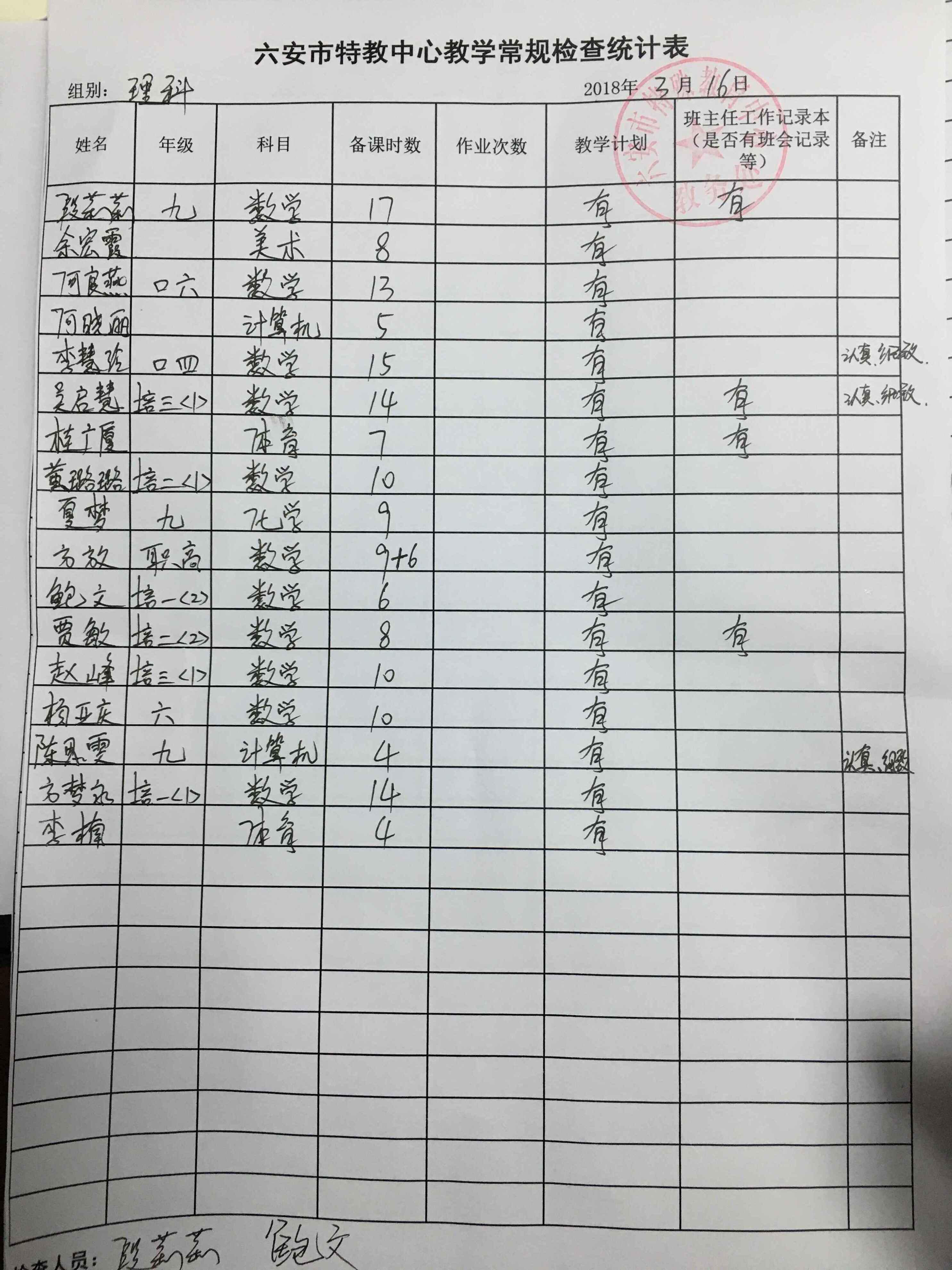 为加强学校教学常规管理,确保教学常规的扎实推进,切实提高教育教学质量,2018年3月16日下午,六安市特殊教育中心教务处组织各科教研组长对全体教师进行了一次学期初教学常规检查活动。EndFragment