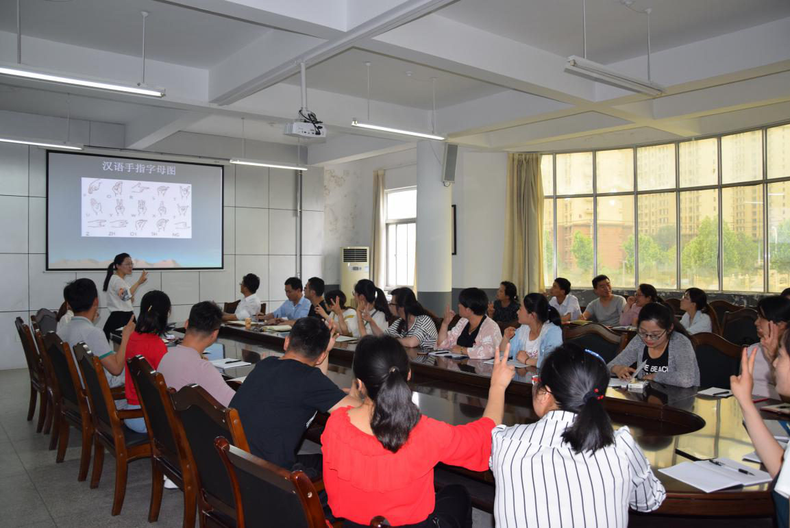 在教务处的精心组织下,第一期手语培训的主讲人由学校手语专业教师李慧玲老师担任。李慧玲老师通过精心准备的课件,结合丰富的理论知识和实践经验,带领大家温习了中国手语中的字母表,从日常生活中提炼出部分常用的词汇和实用的会话进行了手语培训。培训过程中,李老师还向大家强调说明了手语虽然具有一定的稳定性,但也要兼顾美观大方,运用手语时,注意要把握手势的动作幅度、动作的指向、表情特征等要点,有时也结合一定的情境来理解手语的意义。培训时,大家还进行了积极的交流,跟着李老师讲授的内容认真的进行练习,整个培训活动中气氛活跃,学习氛围浓厚,交流热烈。