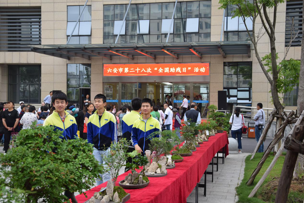 为迎接第二十八个全国助残日,宣扬“全面建成小康社会,残疾人一个也不能少”的主题,我校于2018年5月20日助残日当天,在六安市残疾人康复中心举办了一场水旱盆景作品展会。