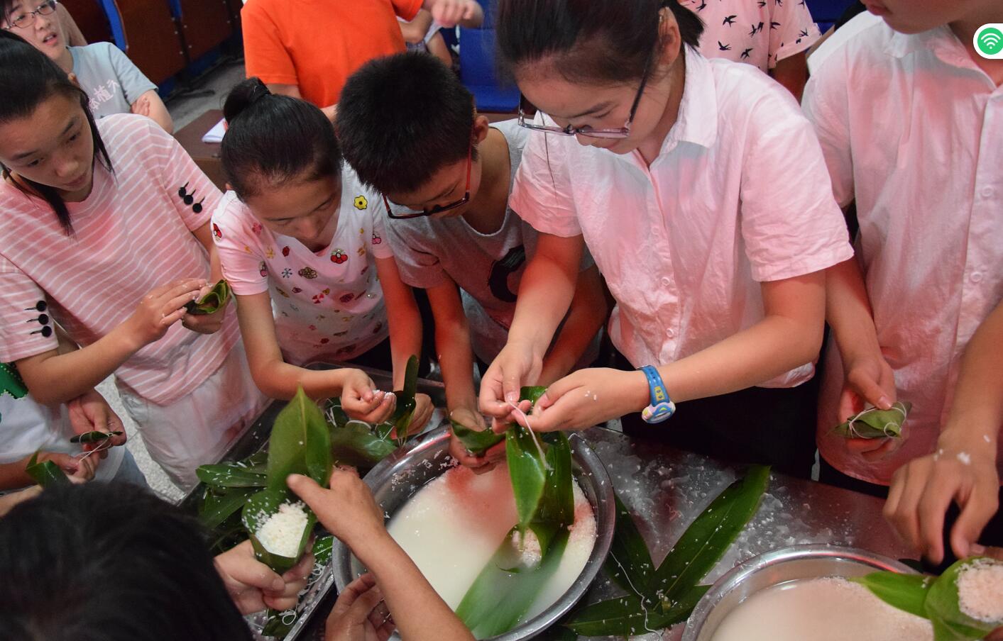 在各班班主任和教师们的组织下,包粽子活动开始了,教师们先向学生们讲解了包粽子的基本步骤和方法,学生们都围在一起仔细的学习着。折叶、压实、裹叶、扎绳,每一道看似简单的工序,对很多第一次学习包粽子的学生来说,都要花费很大功夫,来来回回尝试多次。经过一阵忙活,一个个粽子终于出炉了,虽然大小不一、形状各异,但大家完全沉浸在自己动手的快乐之中。很多家长也积极参加到活动中,手把手的教着学生们,现场一片欢声笑语,氛围浓烈。