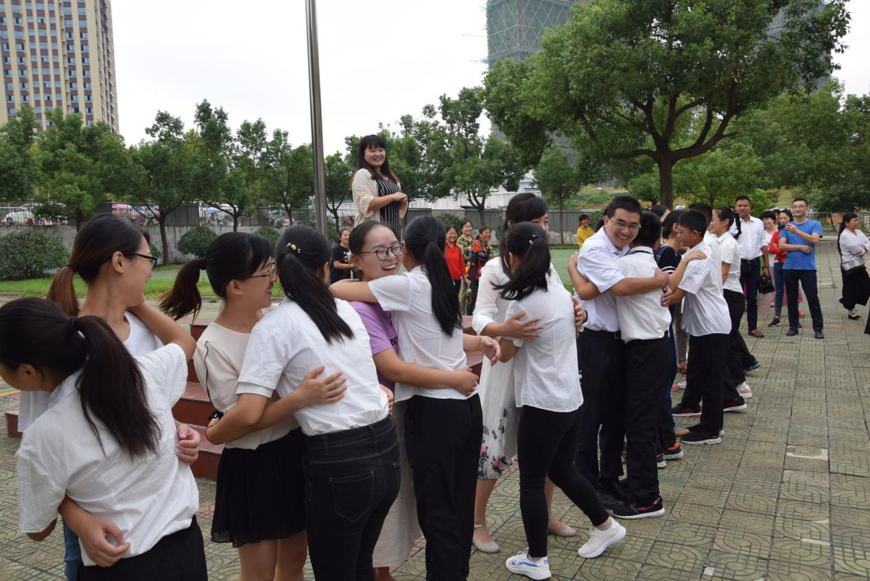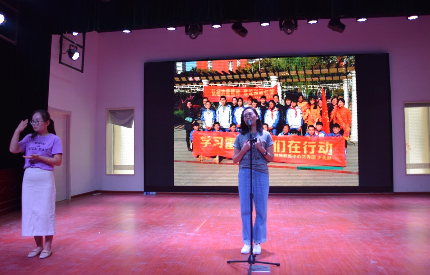 课间学校举行升旗仪式。国旗下学生用手语向老师表达感谢,并给老师们一个大大的拥抱。