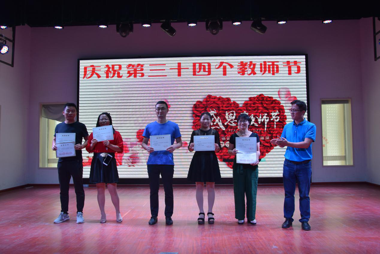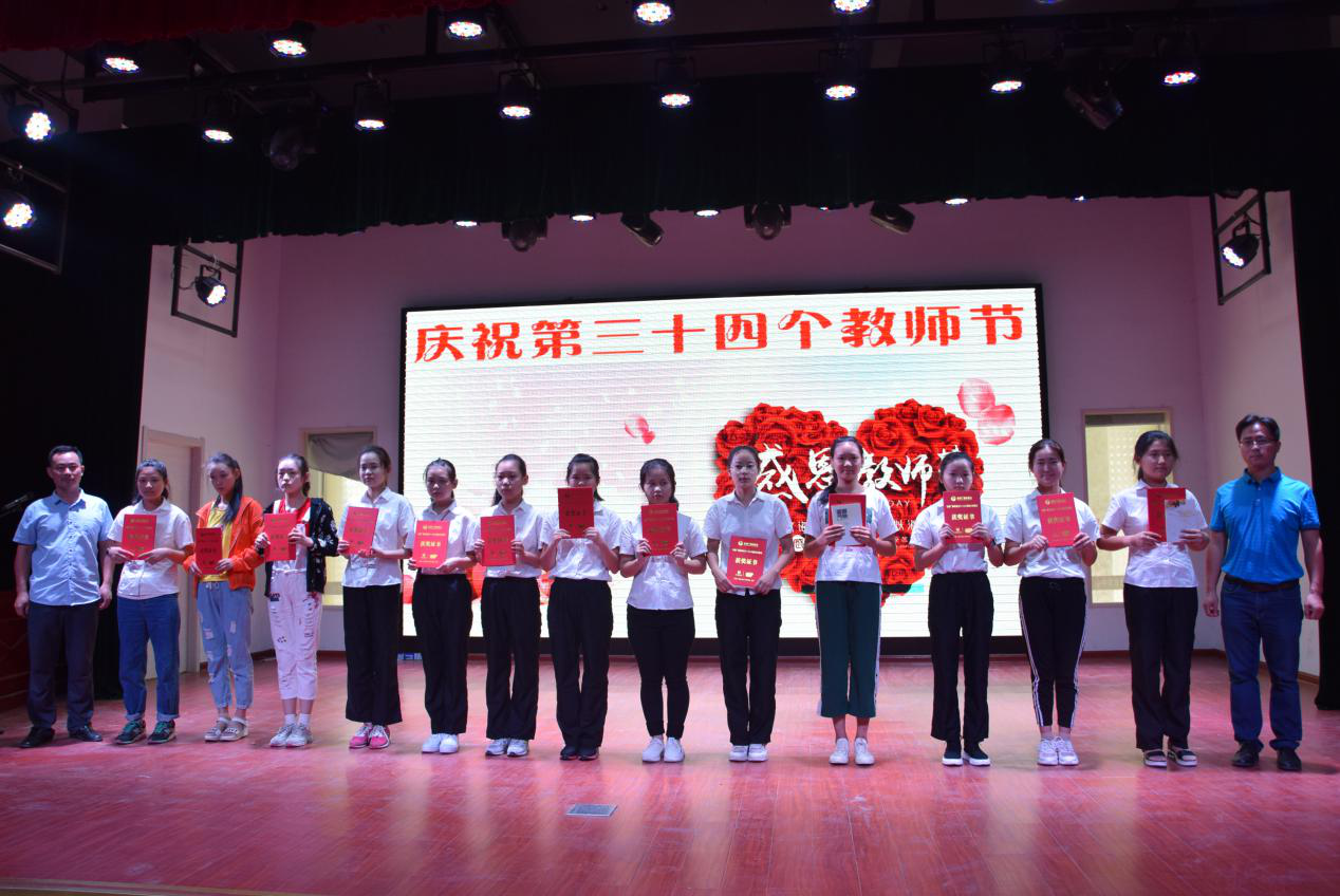 礼堂内,学校举行第三十四个教师节隆重而简朴的庆祝活动,学校领导为荣获省市级竞赛获奖的学生及指导教师颁发证书及奖品。