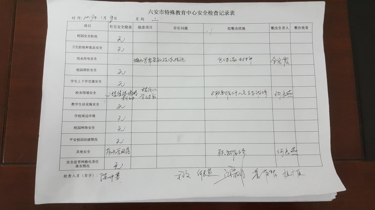为全面落实《六安市教育局关于积极做好雨雪低温天气防范应对工作的紧急通知》的文件精神,保障全校师生人身安全,2019年1月8日下午,在暴雪来临之前,六安市特殊教育中心积极响应,专门开展了一次校园安全隐患大排查工作。