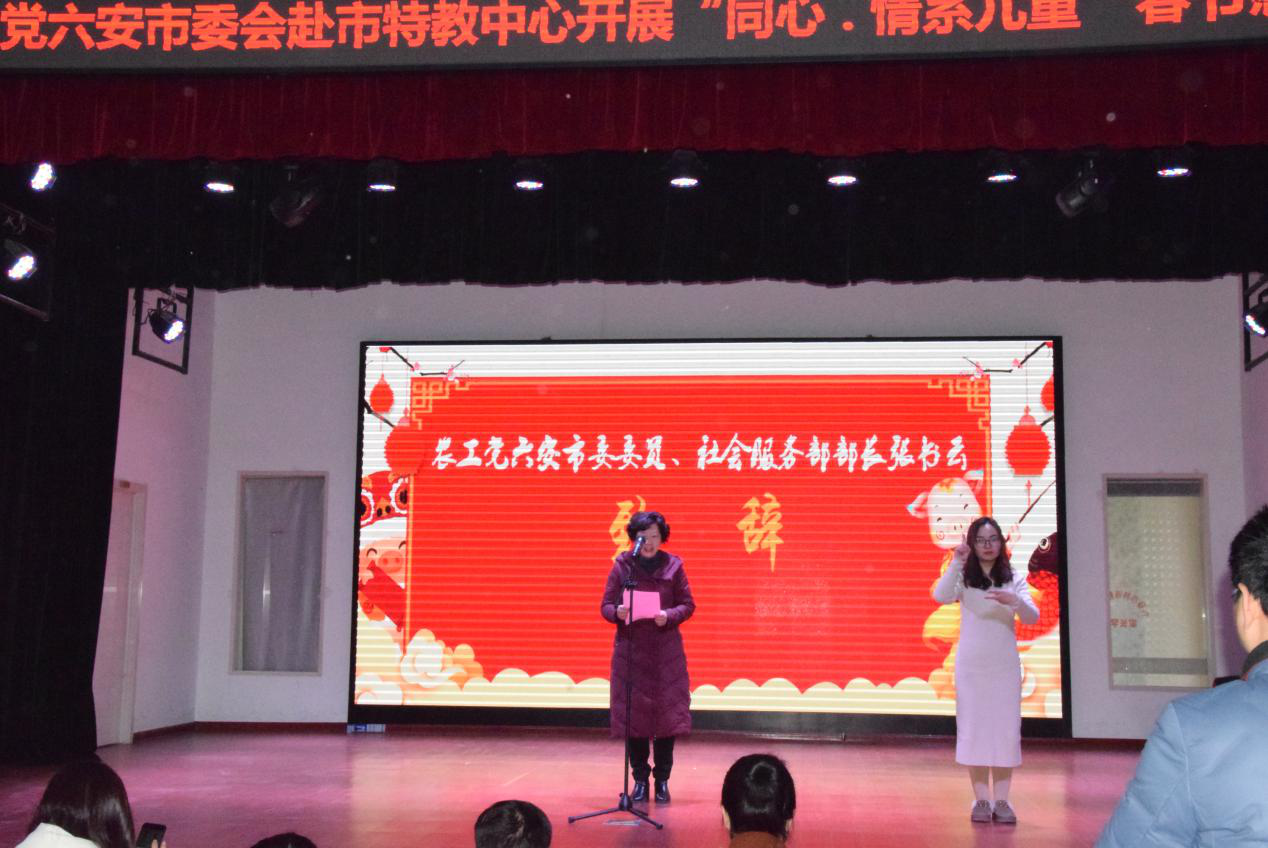 随后,农工党六安市委会委员、社会服务部部长张书云致辞,张部长向各位师生及家长致以亲切的问候,她详细介绍了农工党六安市委会开展的“同心”系列帮扶活动的有关内容,特别表示,要将我校作为该系列活动的长驻联系点,以切实帮助学校残疾贫困儿童的学习和生活。EndFragment