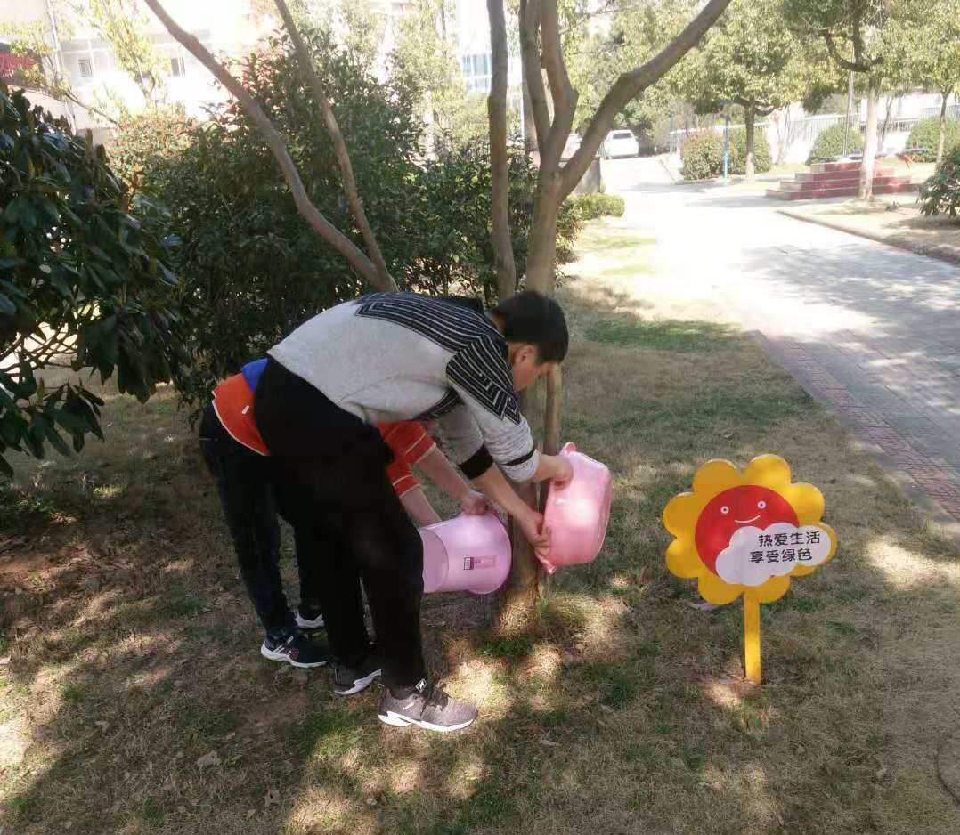 培智二年级学生们正小心翼翼的给校园里的小树浇水