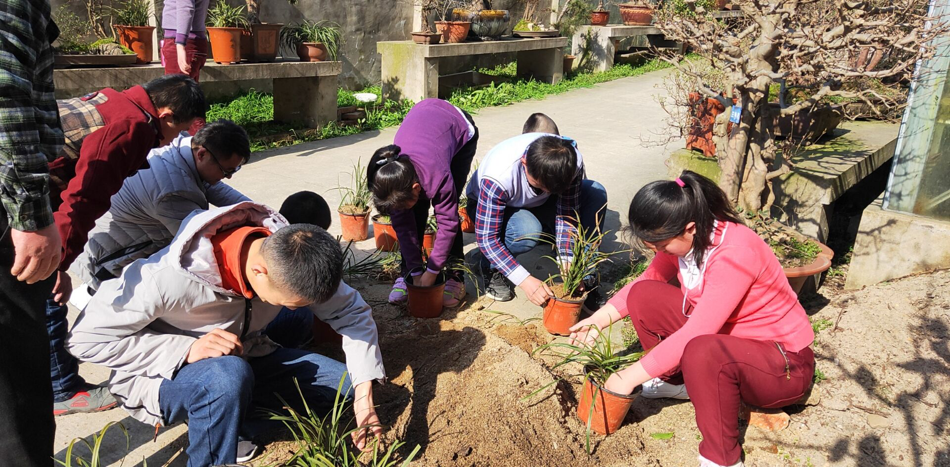培智四年级学生在老师的带领下,自己动手学着将一棵棵兰花苗栽进了花盆里