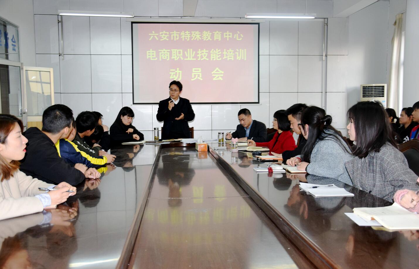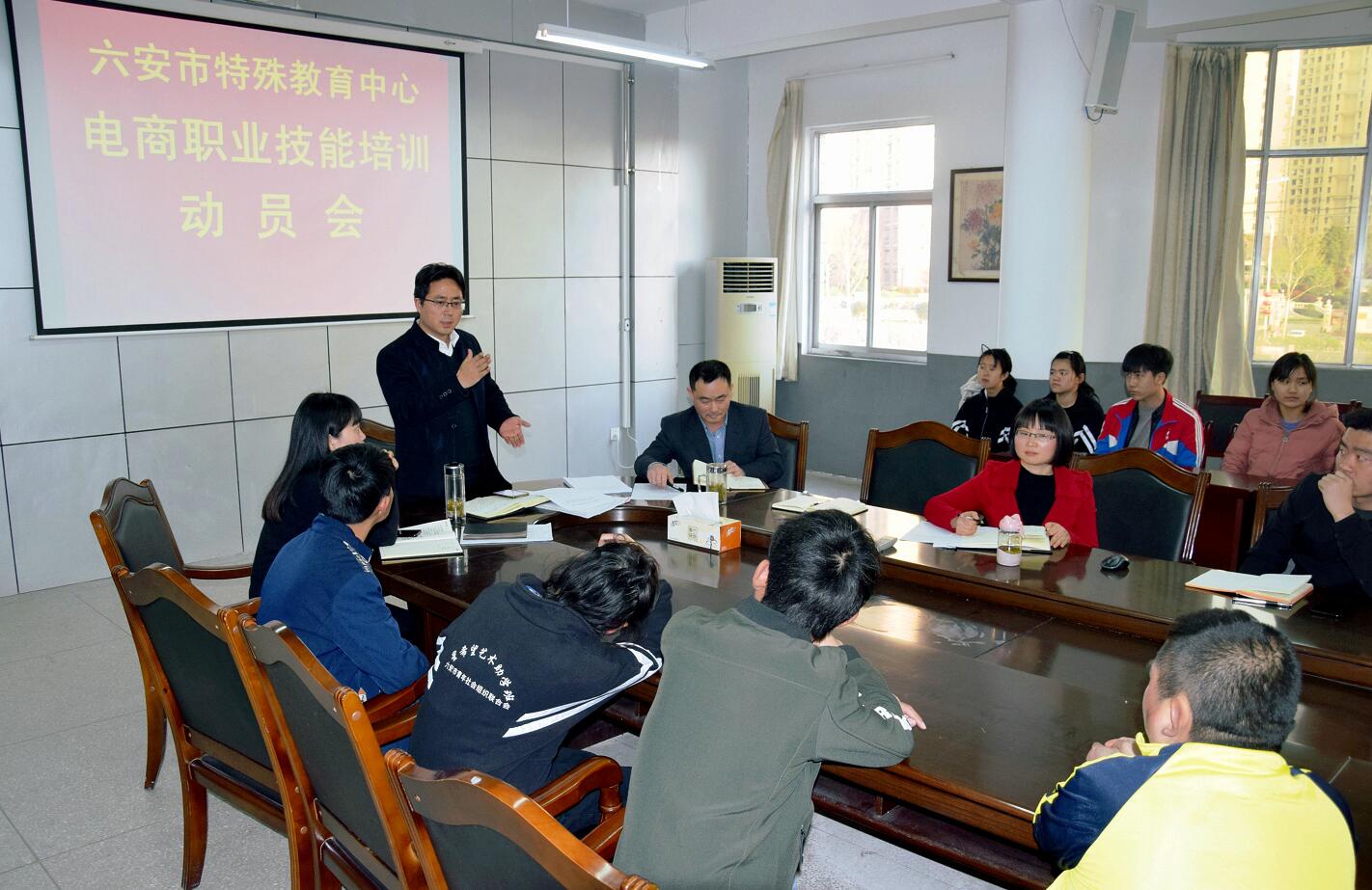 3月25日下午,电商职业技能培训动员会在六安市特殊教育中心会议室召开。会议宣读了《六安市特殊教育中心职业教育电商运营方案》,对下一阶段我校网络营销与电商职业技能培训工作进行了安排部署。六安市特殊教育中心全体教师和职业高中学生参加了本次会议。