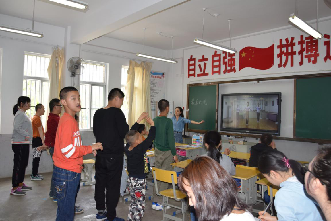 董娟老师利用本班学生照片吸引学生注意力,告诉学生追寻梦想要坚持不懈、不怕艰难,从而导入本课课题《最美的光》。课堂上,董娟老师首先讲解歌词中不轻言放弃的精神,再一句句的教学生学唱歌曲,最后教学舞蹈。在教学舞蹈环节中,董老师充分调动学生积极性,并特别照顾到了个别学生,体现了特教课堂个别化分层教学理念。