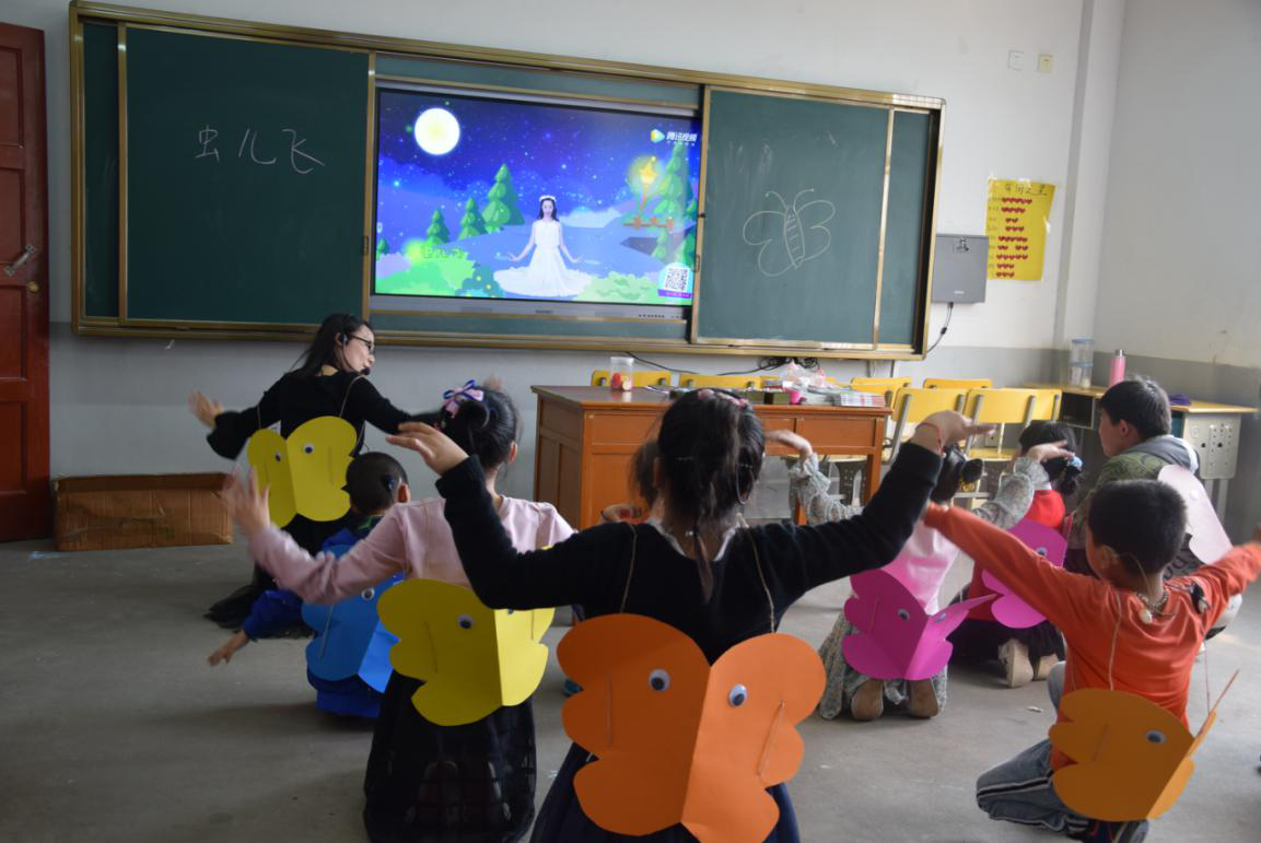 王老师通过猜谜语的形式导入课堂,并与学生一起欣赏美丽的蝴蝶图片,语言生动有趣,激发学生的兴趣。接着带领学生齐读歌词,加深记忆;结合视频和照片,领唱教学,反复练习。当学生们看到自己日常生活中的照片时,孩子们更加开心快乐,课堂气氛温馨而欢快。在教授舞蹈动作环节,王老师通过角色扮演的方式,给每位学生戴上手工制作的蝴蝶翅膀,吸引孩子们注意力。学生们在老师带领下,认真学习分步动作,逐句配合舞步,循序渐进领悟。