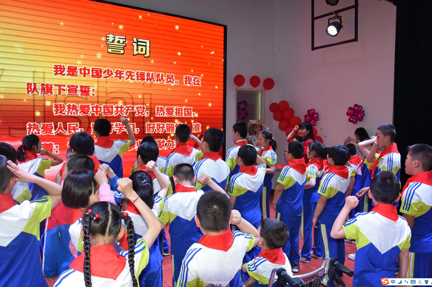 “我们是共产主义接班人,继承革命先辈的光荣传统........”伴着嘹亮的队歌,少先队入队仪式正式拉开帷幕,少先队员与旗手们迈着整齐的步伐,庄严出队旗,老队员为新队员佩戴上鲜艳的红领巾,新队员们个个激动万分,团总支书记何良燕带领新老队员宣誓,虽然有的少先队员们语言不够清晰,但一字一词都读的铿锵有力。