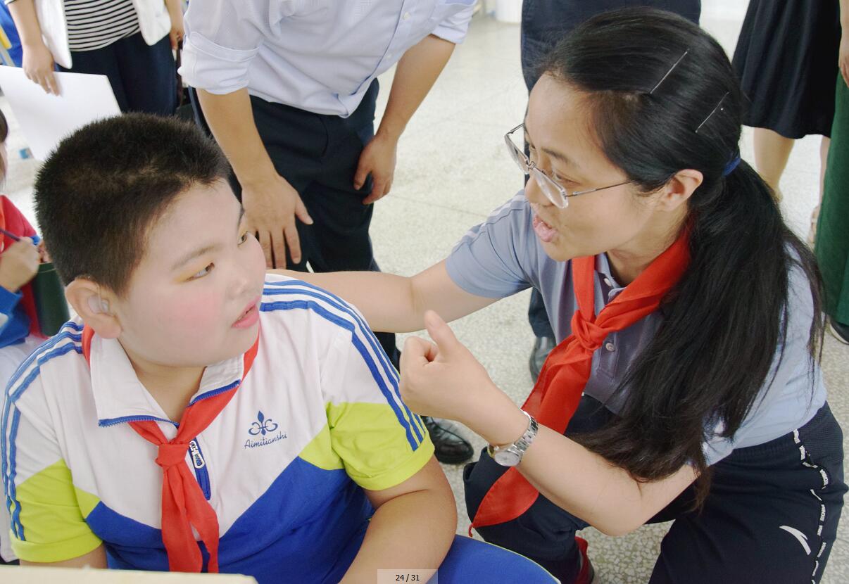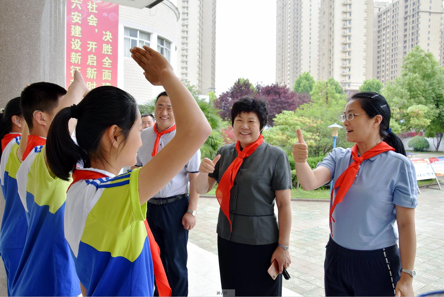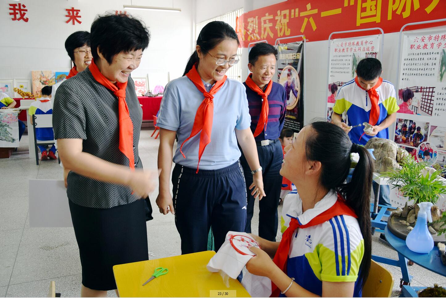 六安市特殊教育中心的残疾孩子们听说王岚副市长又要来看望他们,兴奋不已,将早早准备好的鲜艳红领巾为王岚副市长一行领导系上。王副市长躬身戴上红领巾,与残疾孩子热情拥抱,并用手语表达对孩子们的感谢。