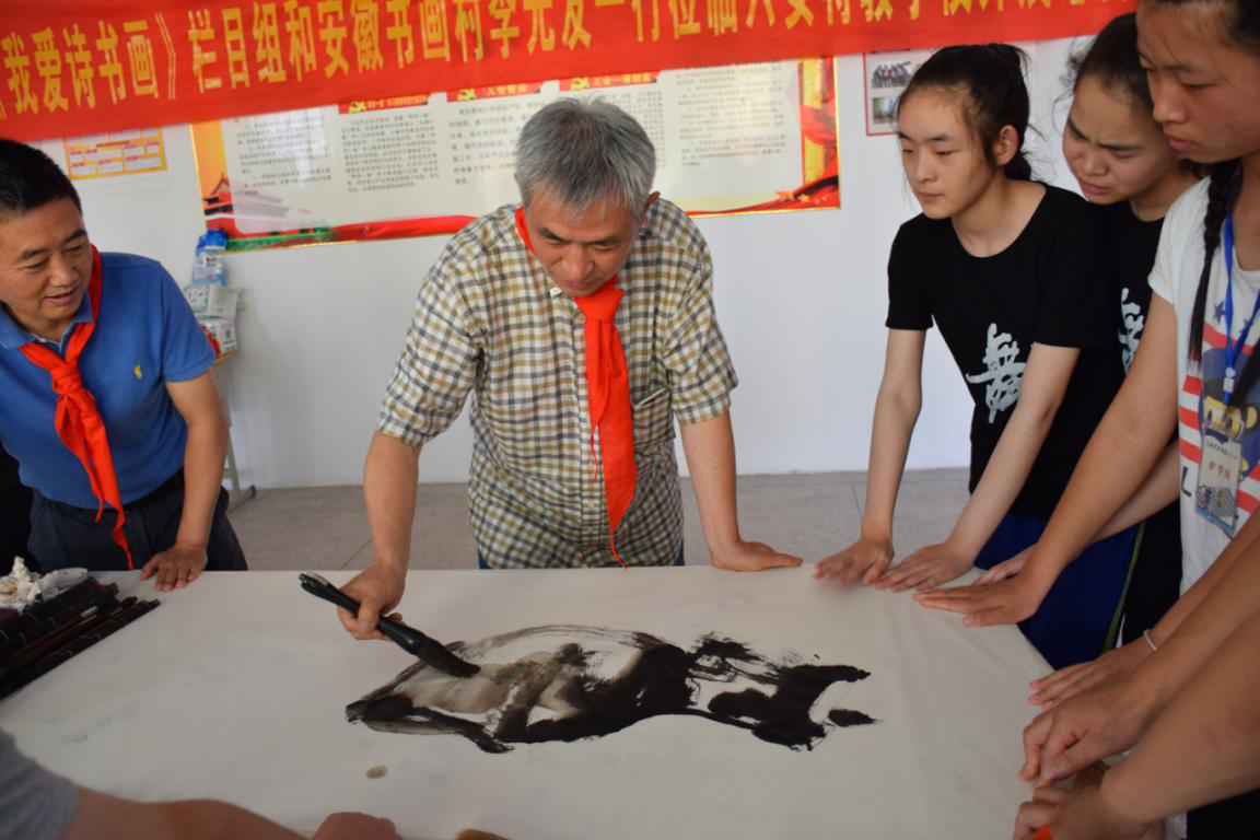 书画专家现场对学生的运笔、构图、用色进行针对性地指导