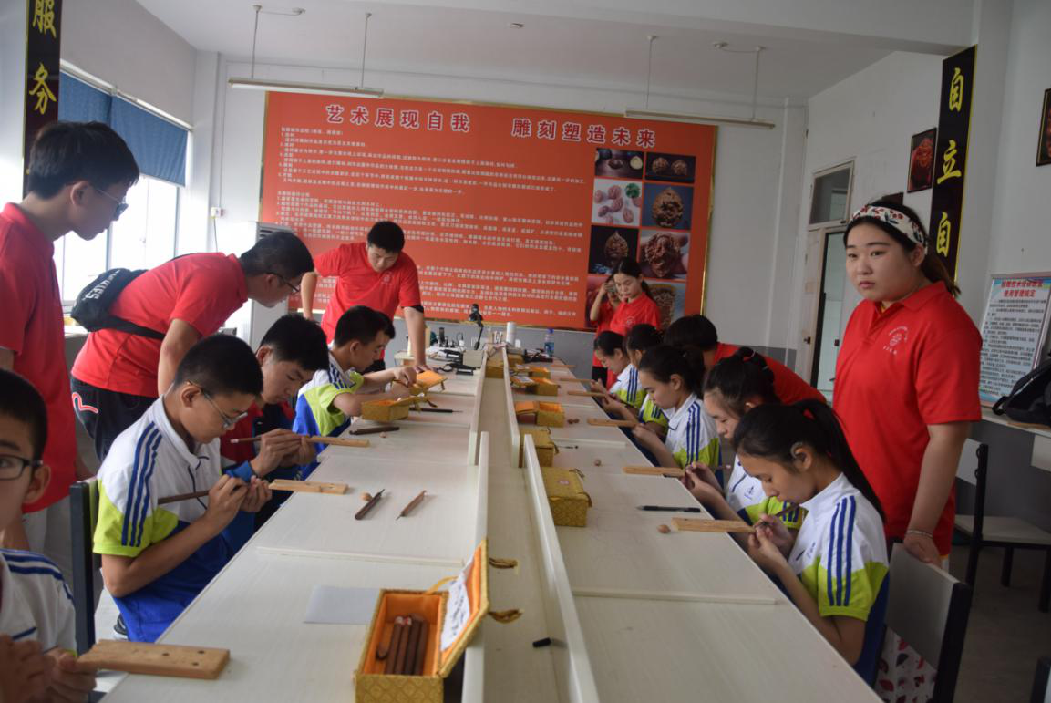 关爱特殊儿童服务团以暑期社会实践活动的形式,对特殊儿童开展一系列充满爱心的志愿活动。首先服务团的大学生在校领导的陪同下,来到学校开设的残疾学生职业培训核雕教室,与正在进行雕刻培训的学生进行互动交流;接着又来到学校盆景制作基地,与残疾学生一起制作盆景,观看盆景制作工艺过程,随后,“三下乡”关爱特殊儿童服务团的大学生又与特殊儿童开展了多项生动有趣的交流活动,包括各种小游戏,给特殊儿童赠送文具与礼品,与特殊儿童谈心,以及对特殊儿童学习生活环境的实地考察等活动。