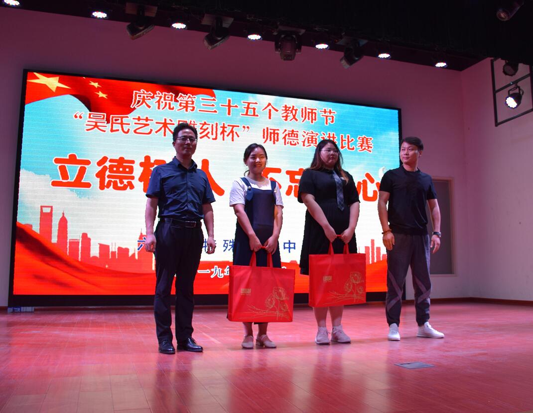经过激烈的角逐,评委组从演讲内容、语言表达、综合印象以及现场效果几方面对参赛教师的演讲进行综合评分,最终评出一等奖2名,二等奖3名,三等奖5名,吴启慧和高卉苑两名老师综合表现突出荣获一等奖。演讲结束校领导和赞助本次活动的吴氏雕刻负责人吴杰为选手们颁发了奖品。