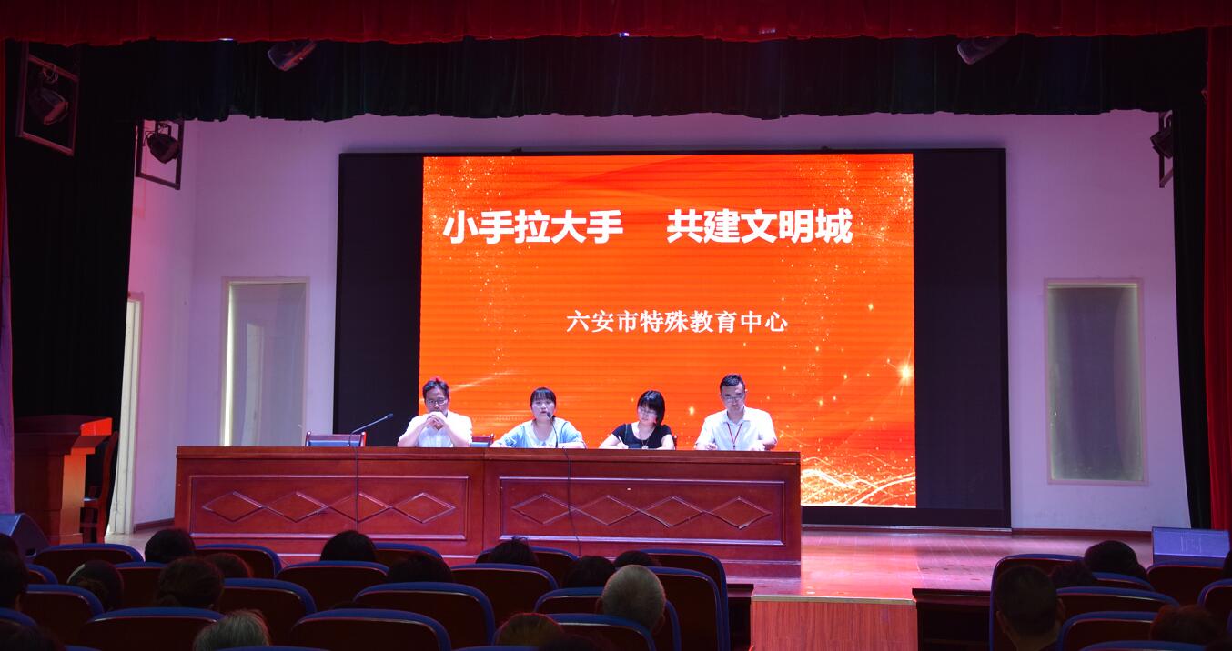 在 9月12日上午召开的家长会上六安市特殊教育中心何良燕主任从公共场所文明行、社区里文明行为 、交通文明行为、公民个人文明行为 、公民职业道德文明行为五个方面向所有的家长进行了宣讲,宣传“创城、创卫”的有关知识。希望每一家长自觉的以主人翁的姿态,做好家庭卫生的同时,积极配合学校、社区开展创城创卫活动,团结一心,为创建文明城市和卫生城市贡献力量。