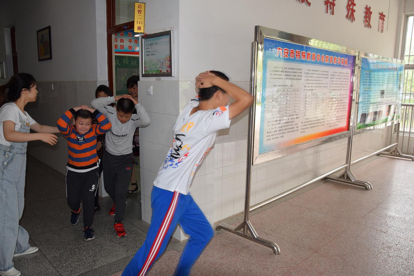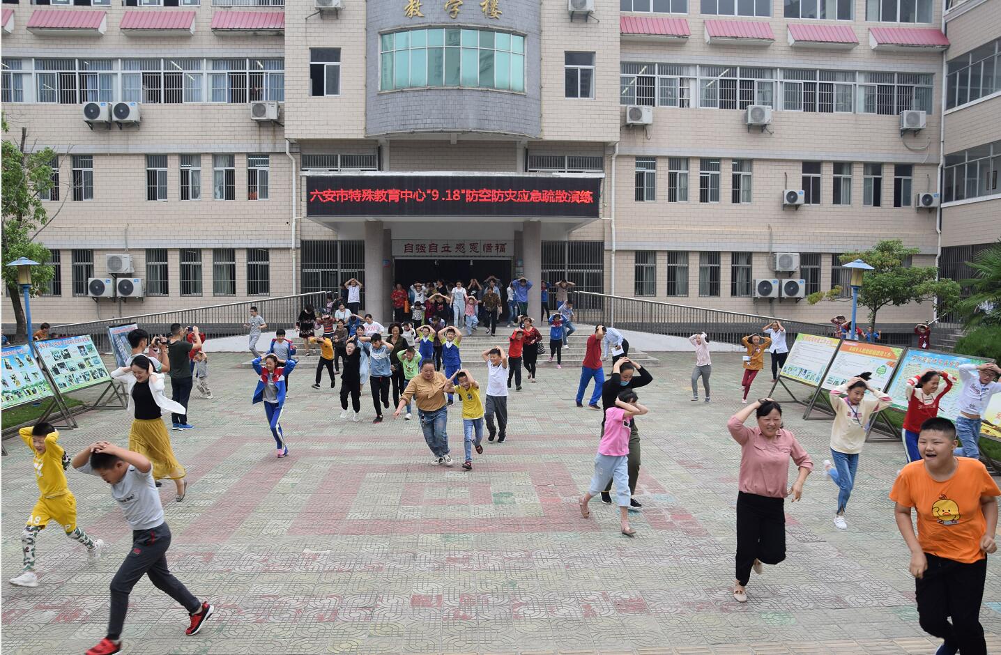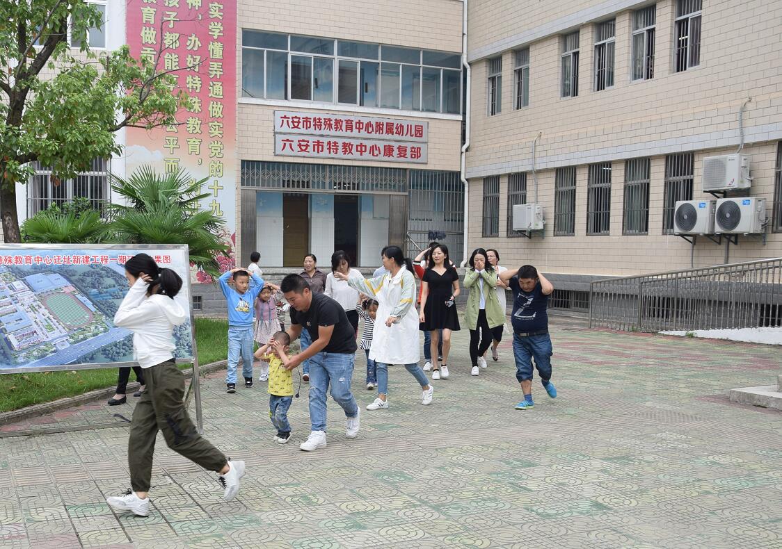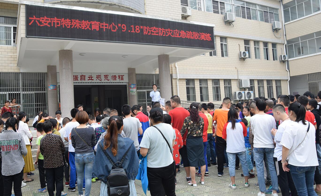 2019年9月18日上午9点18分,急促的防空演练预先警报在六安市特殊教育中心的校园内响起。陈中芳校长在下达指令后,警报声响起,同学们在老师的指导下,迅速从教室起身,有序地沿着走廊边沿,快速向学校教学楼前空旷地带撤离。1分08秒后,师生们全部到达了指定的疏散点。同学们都能按照要求采取规范的防护动作进行紧急避险,蹲在空地,用双手护住头部。随着解除警报的响起,本次演练活动结束。