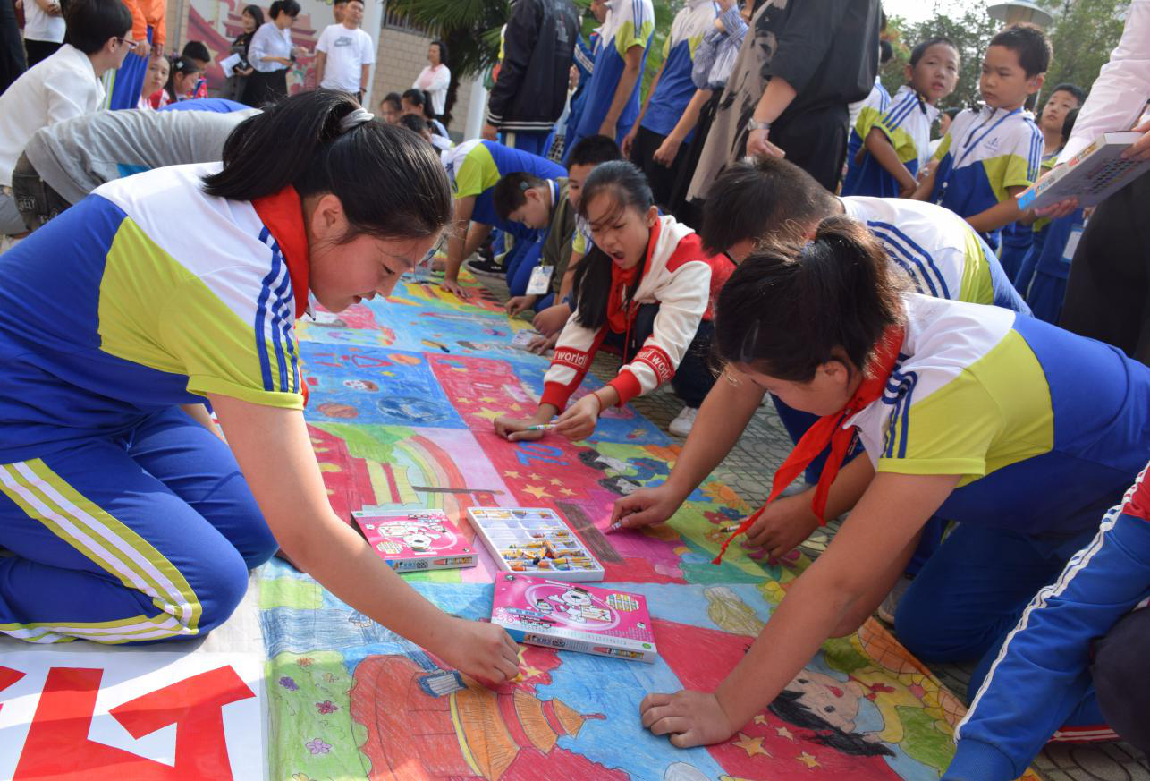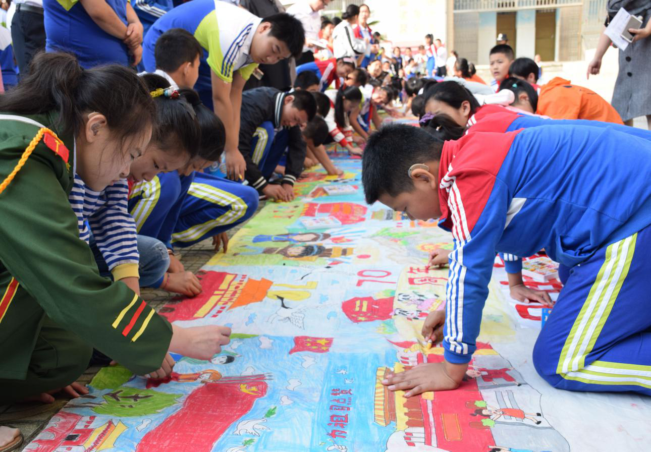 9月30日上午,辉煌70周年,共绘新时代,百米长卷平铺在教学楼前,师生俯下身子,共同绘画,用自己手中的画笔描绘出他们的希望和梦想,用色彩鲜明的长卷来表达对我们伟大祖国的祝福,画卷呈现70年沧海桑田的巨变,70年波澜壮阔的征程。