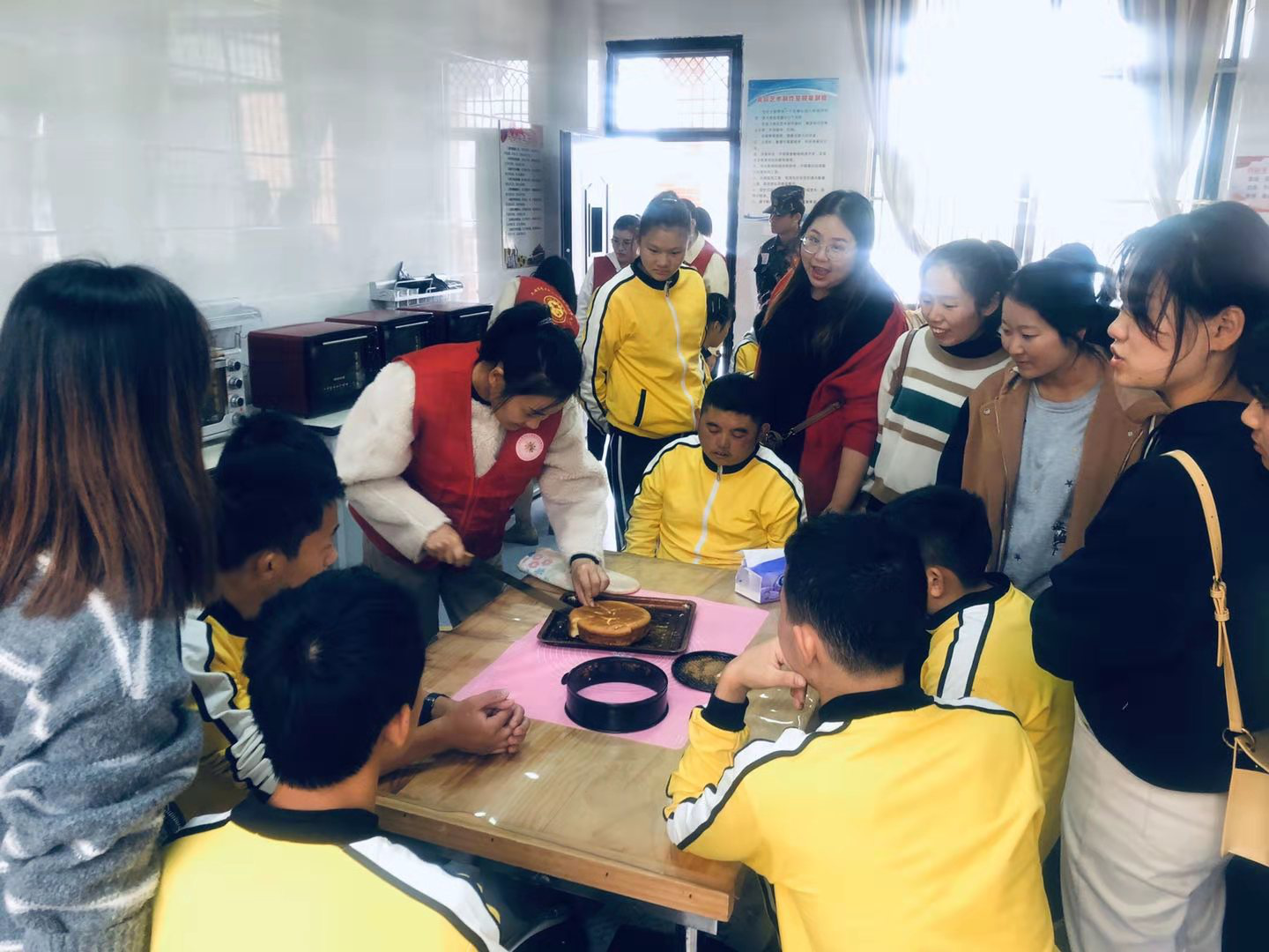 食品制作项目中,在教官的讲解和党员教师的指导下,学生分组协作,积极配合,有条不紊,在制作过程中学生虽经历失败仍兴趣盎然、经反复操作,最终完成出炉蛋糕成品,在品尝亲手制作出的香喷喷蛋糕时,学生们获得了能力提升的成就感,体验了实践的快乐。