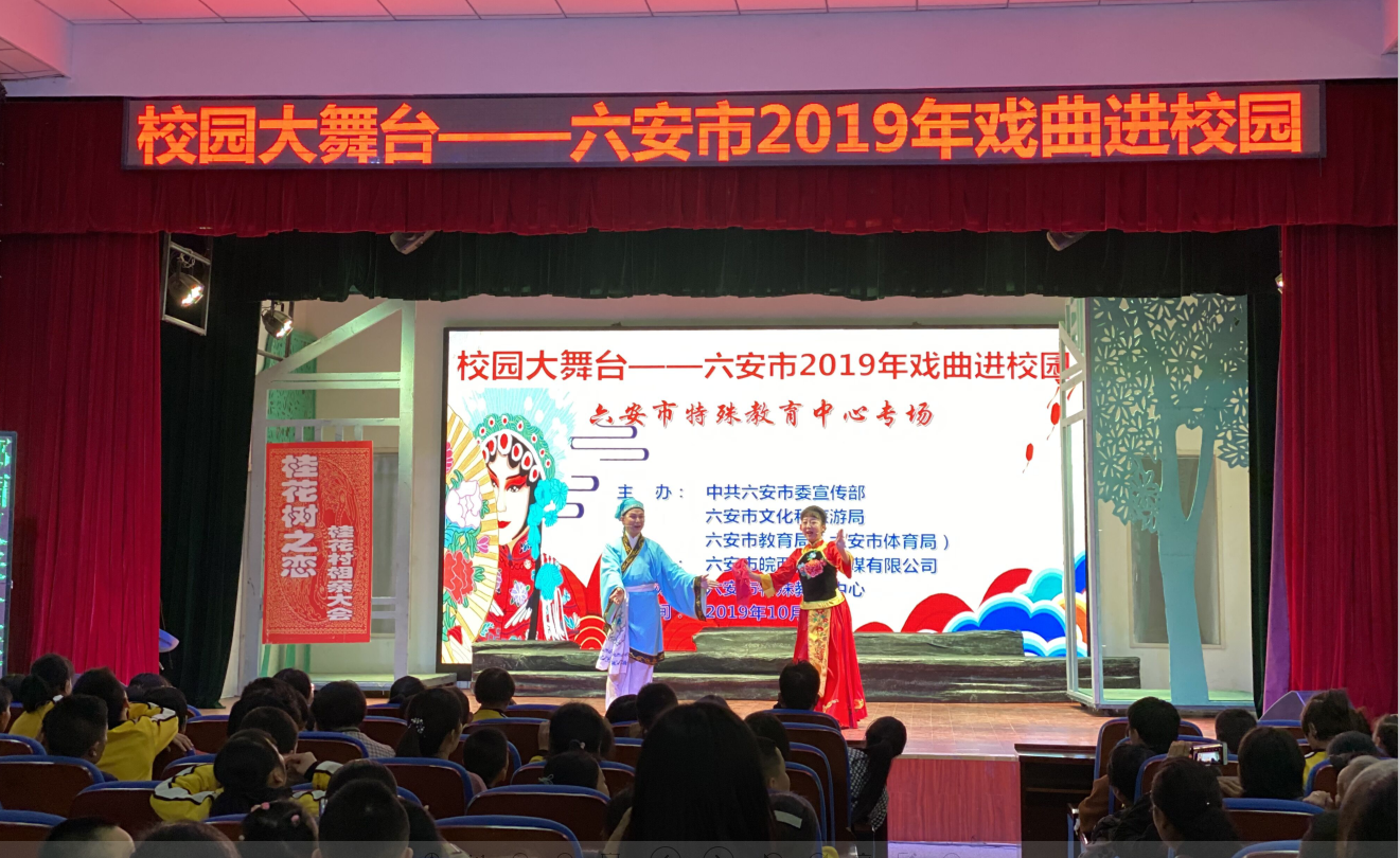 为弘扬中华优秀传统文化,增强文化自信,促进戏曲文化传承与发展,10月31日下午,校园大舞台——六安市2019年戏曲进校园六安市特殊教育中心专场在学校多功能大厅内开演。本次活动由中共六安市委宣传部、六安市文化和旅游局、六安市教育局(六安市体育局)主办,六安市皖西演艺传媒有限公司承办,六安市特殊教育中心协办。
